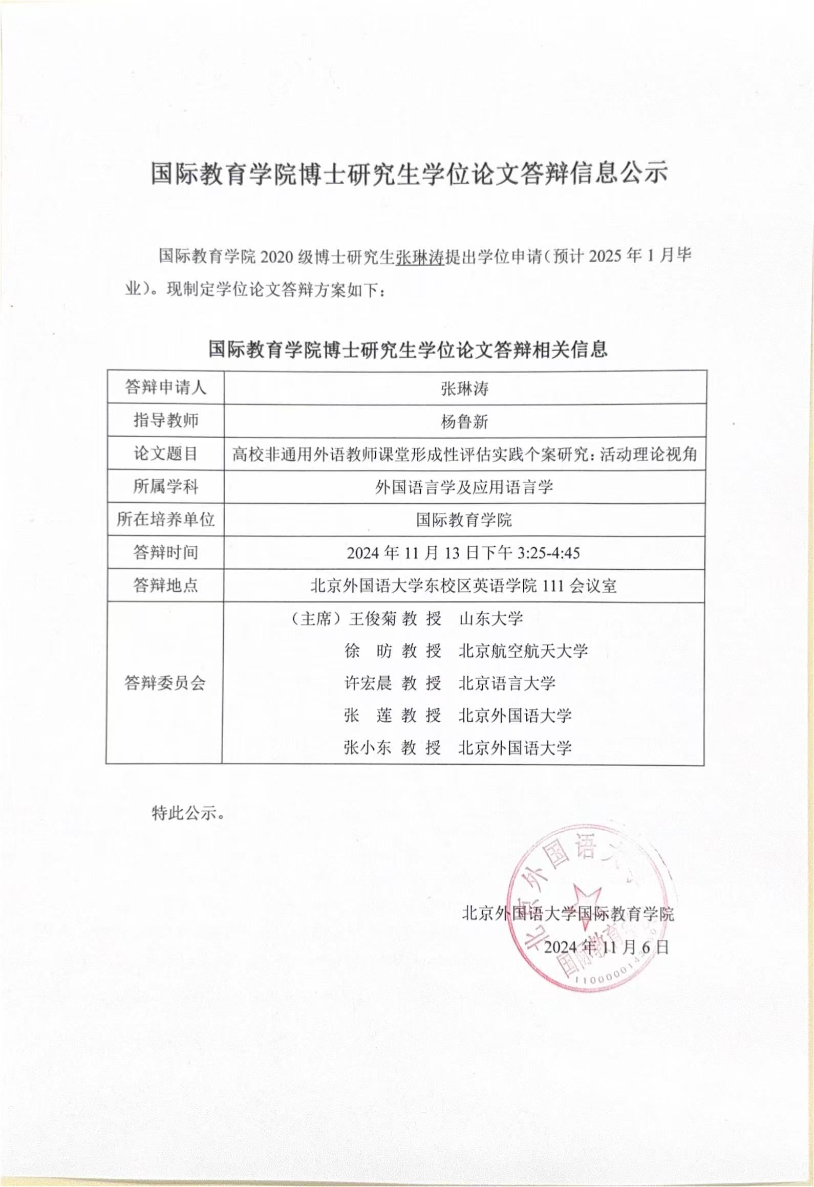 国际yl9193永利集团博士研究生学位论文答辩信息公示