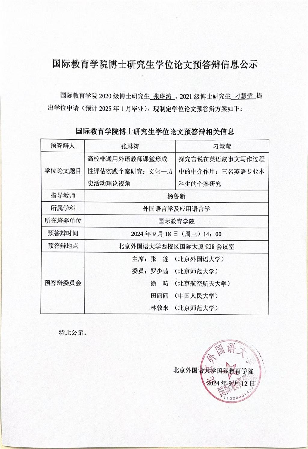 国际yl9193永利集团博士研究生学位论文预答辩信息公示