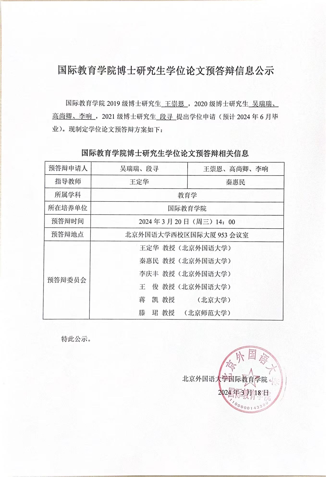国际yl9193永利集团 2021 级博士研究生预答辩信息公示