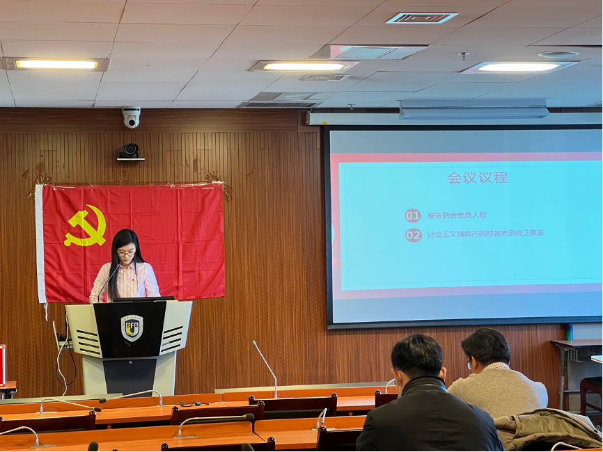 会上,预备党员王文瑞同志向大会宣读了自己的转正申请,入党介绍人介绍了王文瑞同志预备期间的考察情况。团支书甄童同志、班主任尤铮同志等与会党员依次充分表达了各自的意见和建议。大家一致认为王文瑞同志在预备期间能够积极学习党的理论知识,思想上行动上能够和党组织保持高度一致,能够自觉用共产党员的标准严格要求自己,符合党员转正的条件,同意转为正式党员。