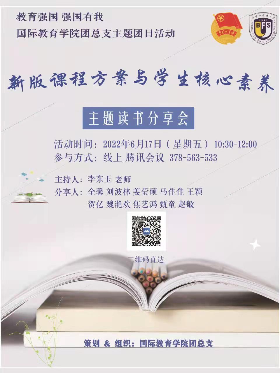 2022年6月17日上午,公司团总支在线开展“教育强国,强国有我”主题团日活动——《新版课程方案与员工核心素养》读书分享会。公司副经理苑大勇,青年教师李东玉、尤铮、寇琨照,以及20余位同学参加了活动。
