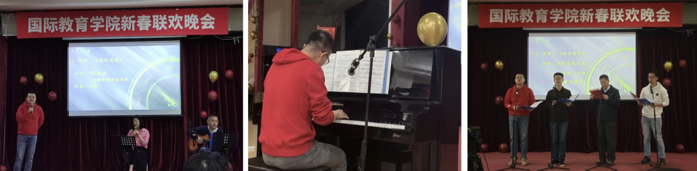 看了同学们的精彩表演,国际公司教师团队毫不示弱,教师们既有吉他弹唱和钢琴独奏,又有专业级别的美声男高音独唱、男女声二重唱,还有男声多声部小合唱,教师们的深情表演使得晚会高潮迭起,令人难忘。