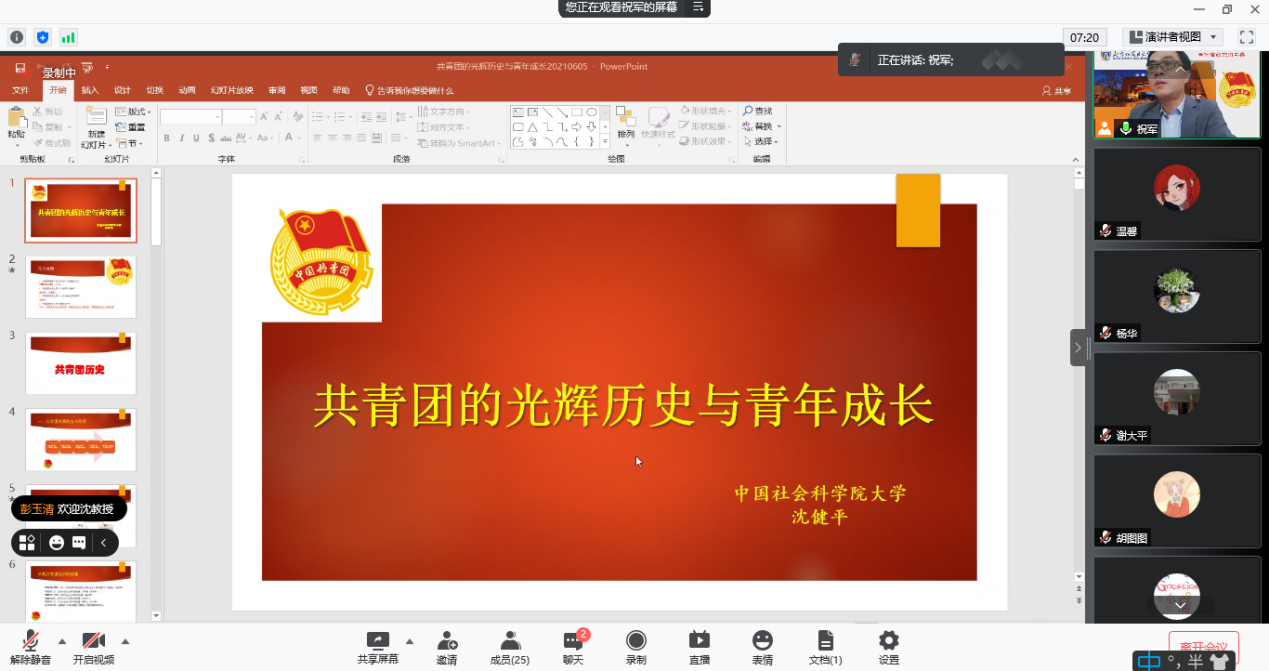 公司研究生成长论坛暨首期团史学习活动于6月5日顺利举行。本次讲座以在线学习的形式召开,中央团校原团委书记、中国社科院大学文公司党总支书记沈健平副教授为公司全体团员员工作了“共青团的光辉历史与青年成长”主题团史讲座,讲座由公司祝军老师主持,公司全体团员和入党积极分子聆听了讲座。