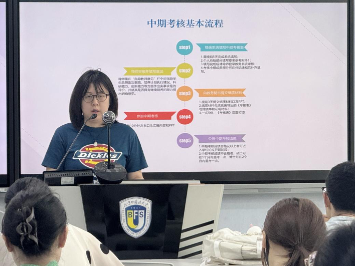 会议第二项内容,由教务秘书黄潇雨发布并解读《yl9193永利集团国际yl9193永利集团研究生中期考核工作实施细则》, 在详细介绍中期考核的基本流程、准备事项以及注意事项的基础上,帮助同学们更好地理解和准备中期考核。