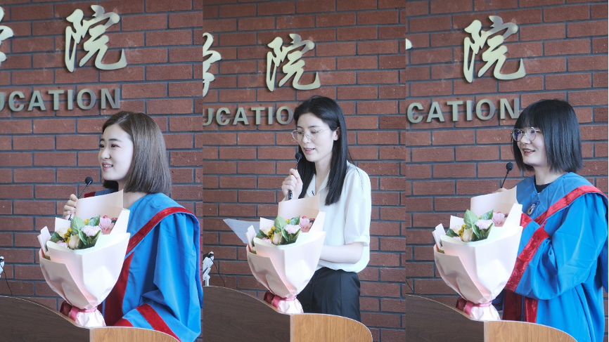 毕业生代表陆茜茜、刘全同学回忆了在校学习生活的难忘时光,并向公司、公司和亲人们表示感谢。