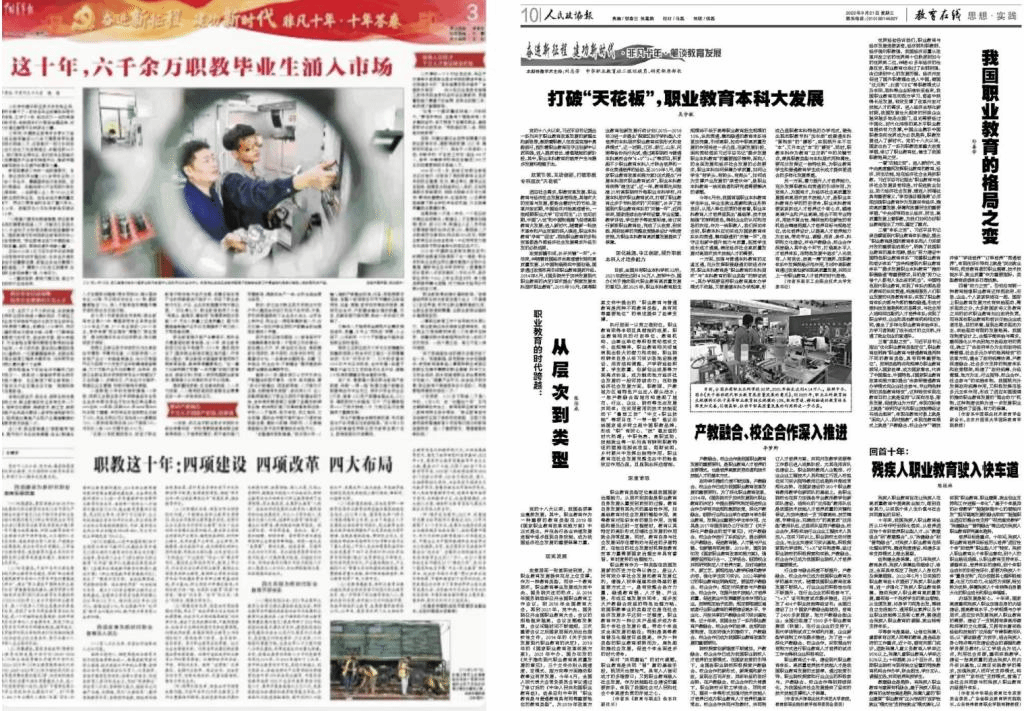 党的二十大召开前夕,《人民政协报》《中国青年报》同日于2022年9月21日分别刊登了中国职业技术教育学会副会长、公司孙善学教授的两篇文章。这两篇文章分别题为“我国职业教育的格局之变”和“职教这十年:四项建设 四项改革 四大布局”。这两篇文章分别以职业教育的十年巨变为主题,对党的十八大以来我国职业教育的发展成就和改革特点进行了系统总结和分析阐述。