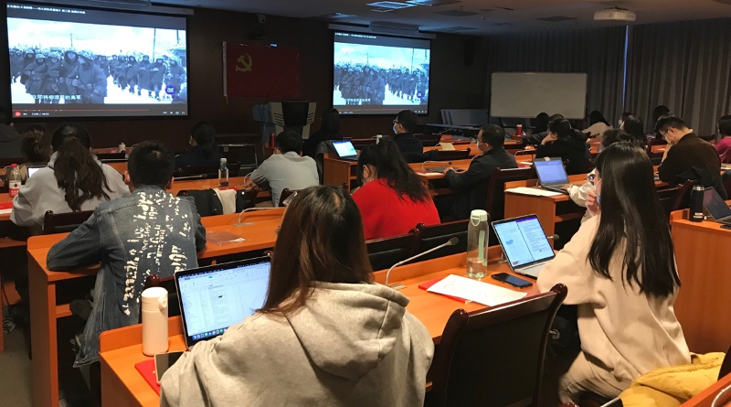 为推进党史学习教育,凝聚爱国情怀,10月27日下午,国际公司党支部组织全体师生党员在国际大厦417教室观看《长津湖》相关纪录片(因疫情原因难以前往影院观影),并以研讨会的形式讨论观看感受,深入交流伟大的抗美援朝精神,提升学习实效。