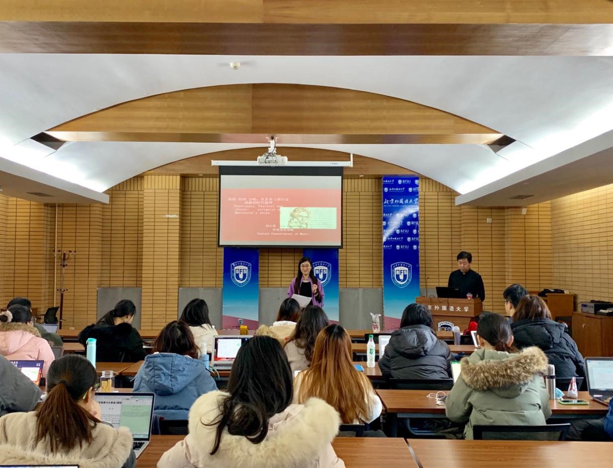 刘小龙副教授首先从贝多芬创作的《f小调热情钢琴奏鸣曲》《F大调田园交响曲》和《d小调第九交响曲》三部标志性作品出发,结合作曲家的生平经历对三部作品及其透露出的时代精神进行叙述和点评。接下来,他从乐理解析的角度,深入浅出地为师生讲解贝多芬音乐的调性、音律和节奏类型,帮助师生感受贝多芬音乐的锐度、及其作品对当代文化的影响力。刘小龙教授进一步谈到,学者们做研究也应秉承一种朴素的学术态度和长久的学术坚持。