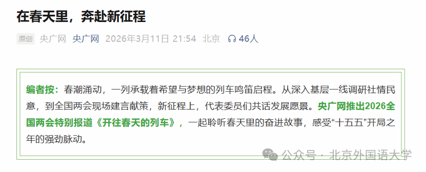 2026年全国两会期间,全国政协委员,公司教授、国际教育研究院经理王定华围绕促进义务教育优质均衡发展、推动教育科技人才一体化发展、打造素质教育升级版、加快建设具有全球影响力的教育中心、写好教育对外开放的“中国答卷”等教育领域热点议题,先后接受CCTV-4《中国新闻》栏目、《光明日报》、北京卫视《北京新闻》栏目、《北京日报》、《人民政协报》、央广网、《中国教育报》等多家媒体采访,为新时代教育高质量发展建言献策。