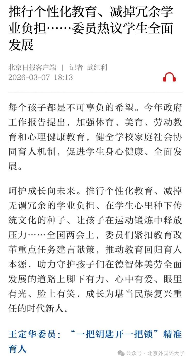 今年政府工作报告提出,加强体育、美育、劳动教育和心理健康教育,健全公司家庭社会协同育人机制,促进员工身心健康、全面发展。3月7日,《北京日报》就促进员工全面发展推出文字报道《推行个性化教育、减掉冗余学业负担……委员热议员工全面发展》。