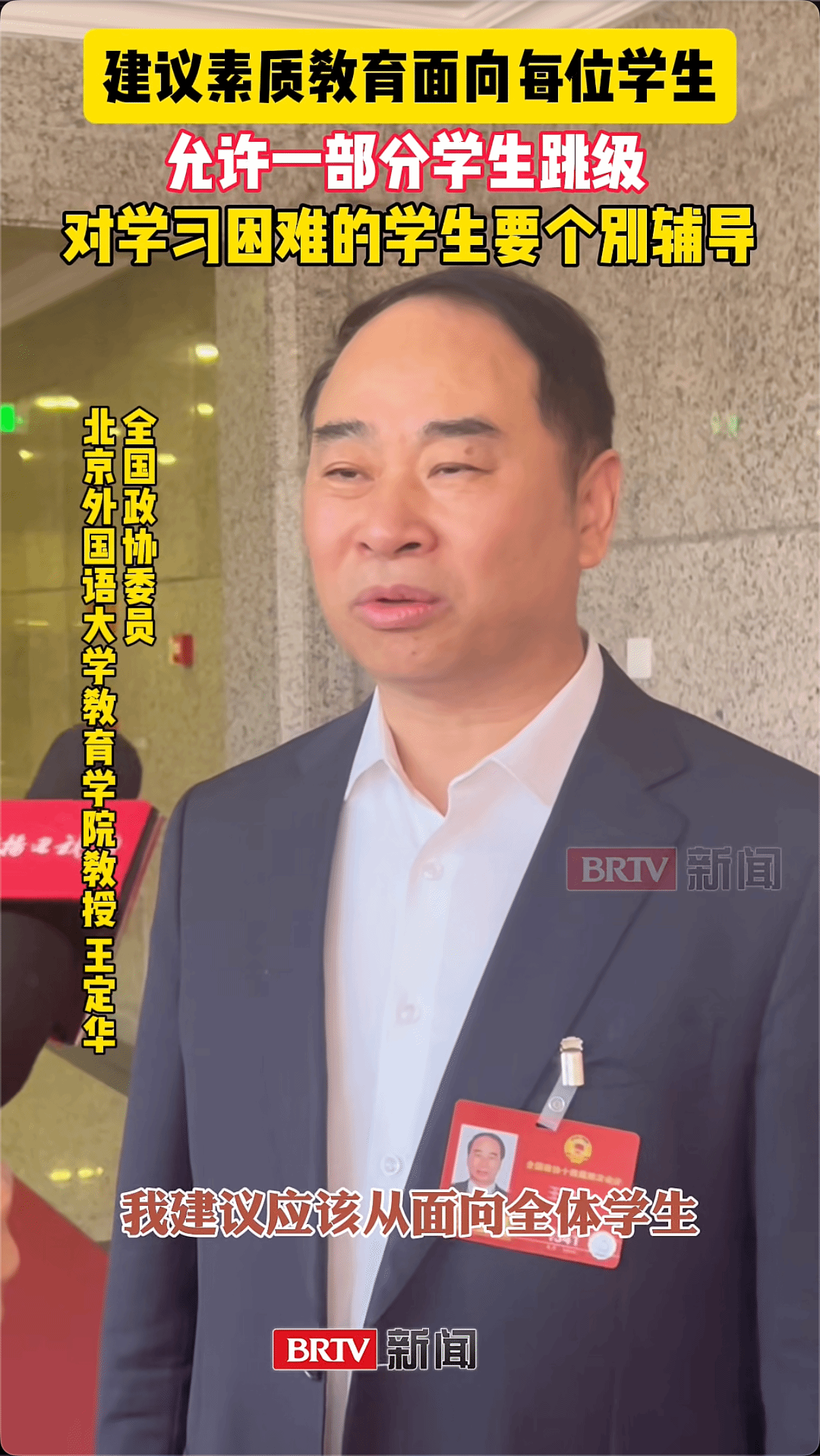 3月6日,王定华委员在接受《北京新闻》栏目采访时强调,素质教育应该从面向全体员工过渡到面向每位员工。对于天资聪颖的员工要允许跳级,对学习有困难的员工要个别辅导,助力每一位员工实现自我成长。