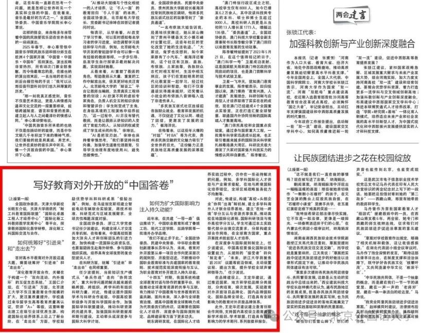 “十五五”规划纲要草案提出,扩大高水平对外开放,开创合作共赢新局面。推动高水平教育对外开放,既是中国教育的责任与使命,也是加快建设教育强国的必然要求。今年全国两会,高水平教育对外开放成了代表委员热议的话题。3月12日,《中国教育报》聚焦 “高水平教育对外开放”推出《写好教育对外开放的“中国答卷”——代表委员热议扩大高水平教育对外开放》专题报道。