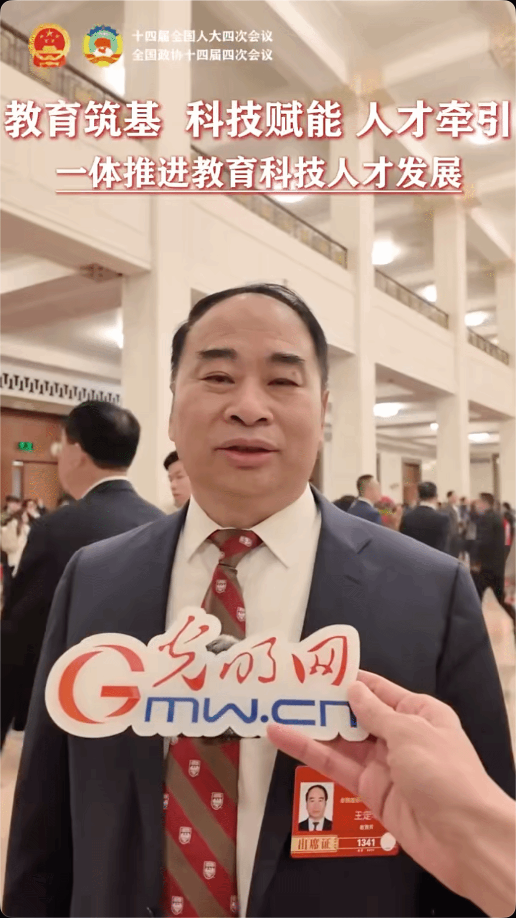 3月5日,王定华委员在接受《光明日报》视频采访时表示,教育科技人才是中国式现代化建设的基础性、先导性、全局性、战略性重要议题。教育科技工作者应主动担当、奉献拼搏,实现教育筑基、科技赋能、人才牵引,推动教育科技人才一体化发展。