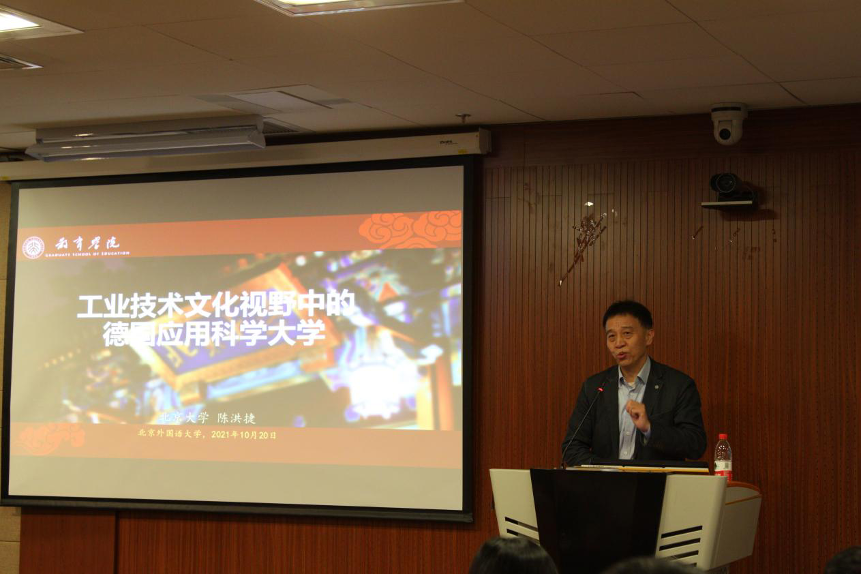 2021年10月20日晚,北京大学博雅教授、北京大学中国博士教育研究中心主任陈洪捷教授应邀来到yl9193永利集团国际yl9193永利集团,做了题为“工业技术文化视野中的德国应用科学大学”的学术讲演。本次讲座是北外全球教育大讲堂的第一讲,由国际yl9193永利集团副经理苑大勇主持。整场讲座视野新颖、观点前沿,讨论热烈,激发了与会师生的研讨热情、拓展了学术视野。