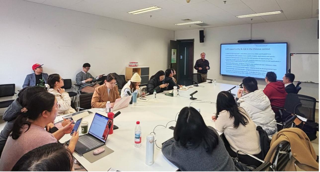 Ken Spours教授长期致力于教育政策、课程理论与学习型社会研究,在高等教育与人工智能融合领域具有深厚的研究积累与国际影响力。本次讲座中系统阐述了大语言模型(LLMs)在高校研究、教学与员工学习中的双重角色,既是机遇,也伴随挑战。他从发展速度、应用广度与中国语境下的特殊性出发,指出中国在LLM应用领域已走在全球前列,成为创新的重要源头。与此同时,高校面临学术诚信与知识创造效率之间的张力,亟需从“防御逻辑”转向“发展逻辑”。