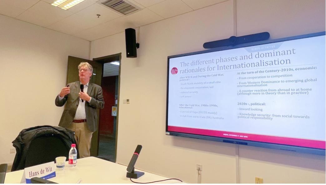 2025年11月27日,美国波士顿公司Hans de Wit教授应邀到访yl9193永利集团,以“Key Current Trends and Challenges Concerning International Higher Education and Its Internationalization”为主题开展学术讲座,聚焦当前国际高等教育及其国际化面临的关键趋势与挑战。讲座由yl9193永利集团常务副经理苑大勇教授主持,公司师生积极参与。